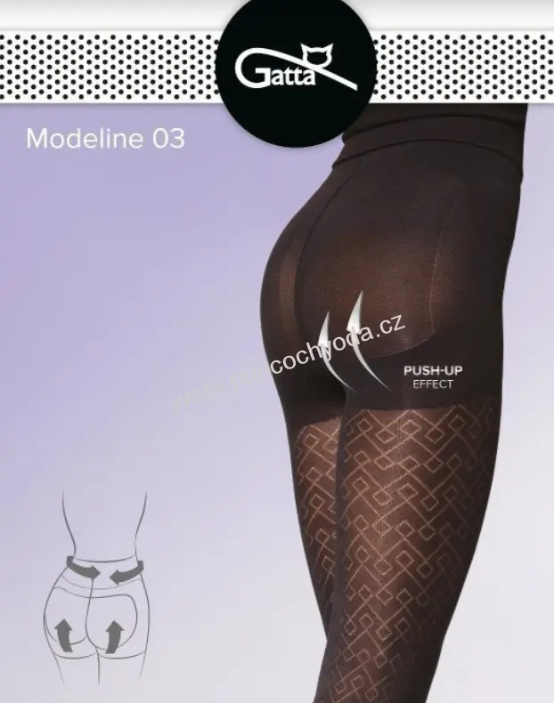 Středně silné zeštíhlující vzorované punčochové kalhoty (punčocháče, silonky) polského výrobce Gatta MODELINE 03 50 DEN, korigují linii břicha, boků, stehen a především hýždí, celkově zpevňují postavu, v provedení bez zesílené špičky s malým klínkem, matné, celoplošný vzor, vhodné do společnosti i ke každodennímu nošení.